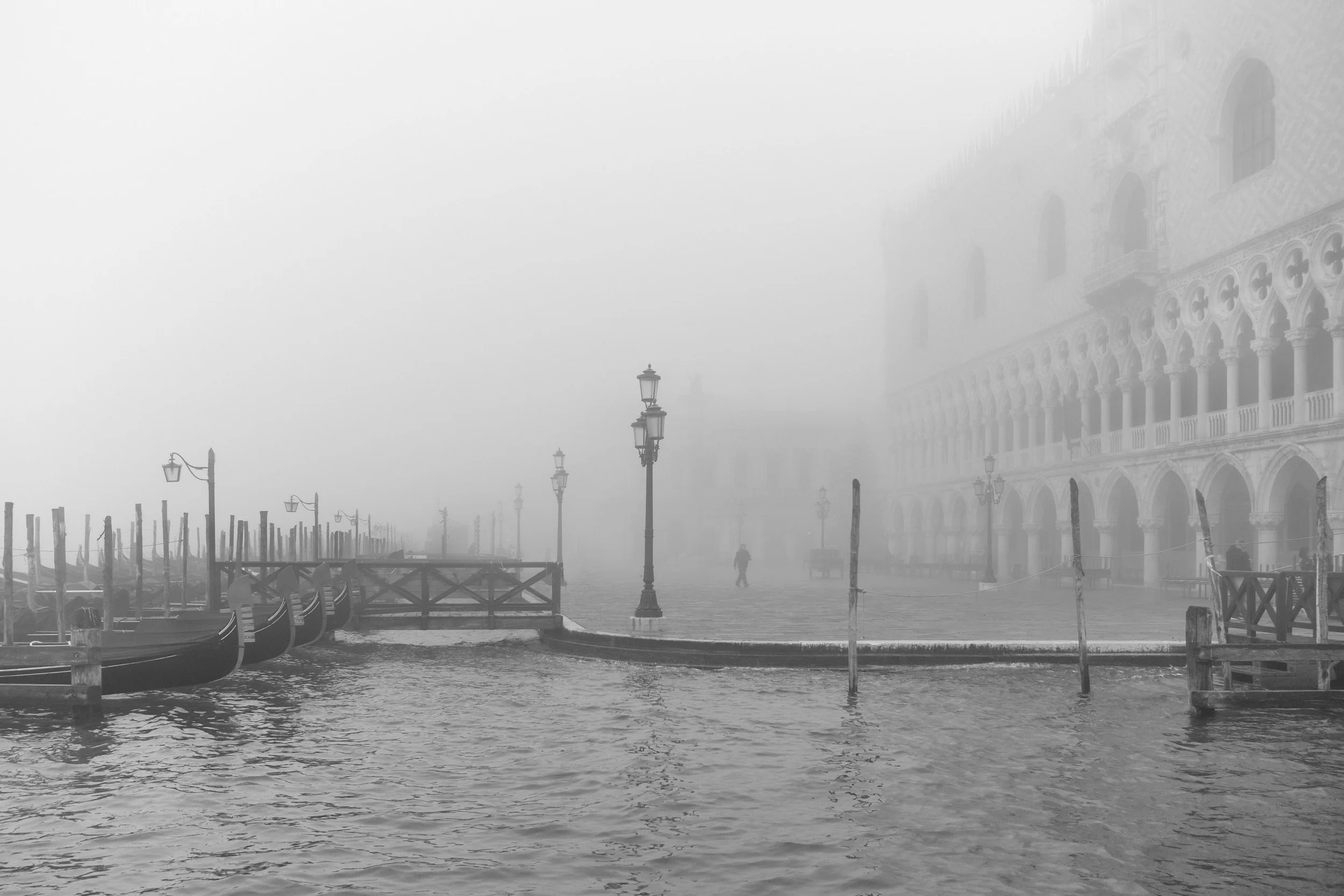 Vor dem Dogenpalast, dessem Ornamentik schon nach wenigen Metern im Nebel verschwindet, huschen nur vereinzelte Pssanten vorbei. So ruhig präsentiert sich dieser Touristen-Hotspot nur in dieser Jahreszeit.