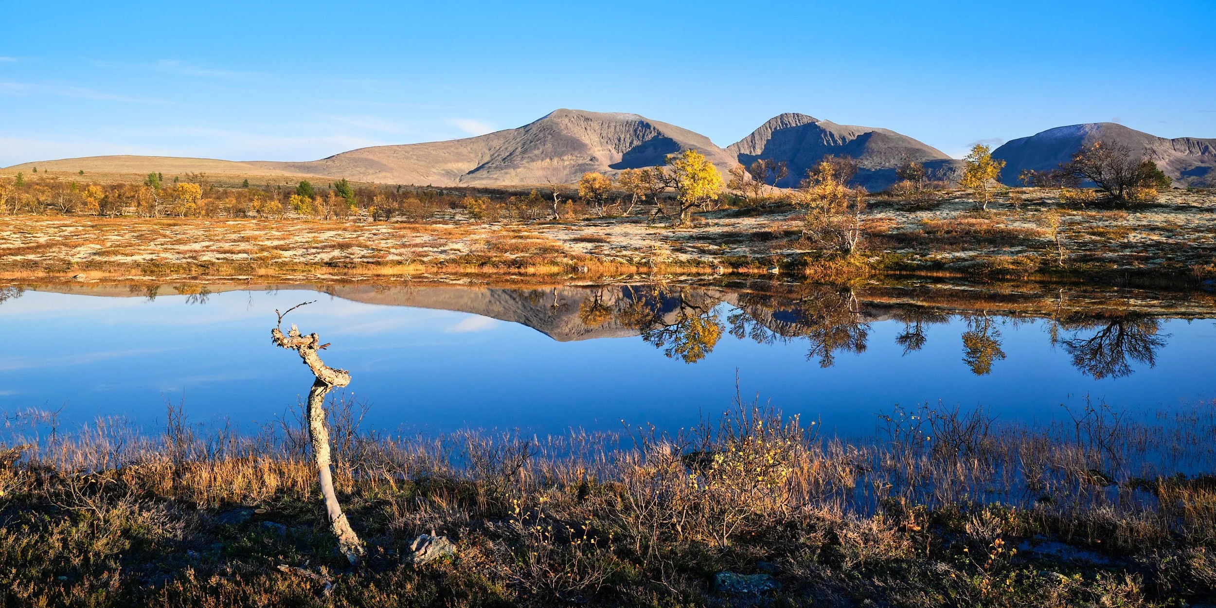 Das alleinstehende Bergmassiv in der Hochebene Ostnorwegens ist nur recht mühsam zu erreichen. Lange Fussmärsche bis zum Bergsockel führen durch einsame Tundra und vorbei an malerischen Seen wie diesem.